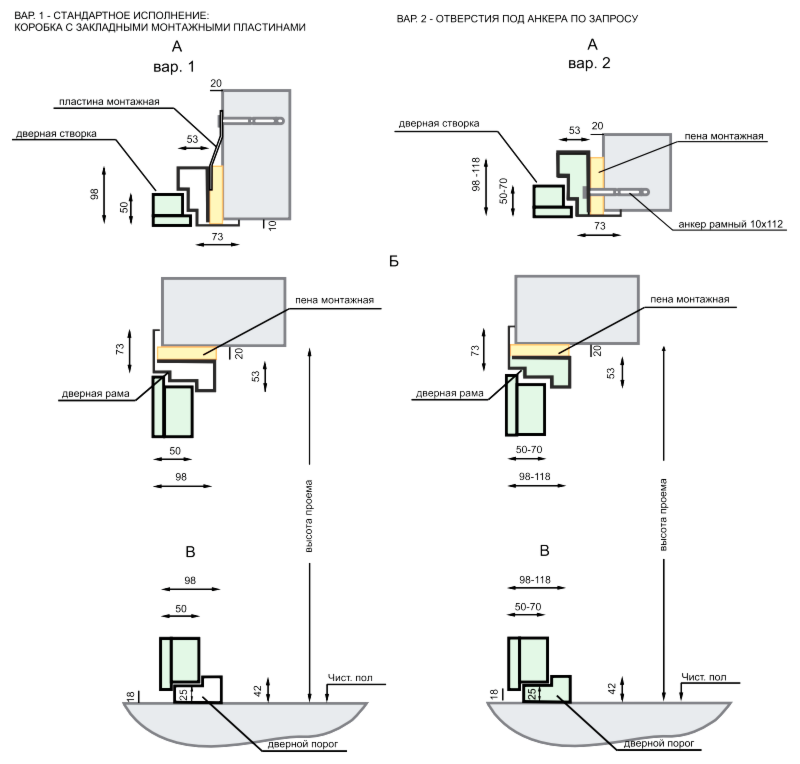 Под подходящий вам вариант монтажа двери мы изготавливаем подходящий вариант конструкции двери. На схемах представлены варианты крепления наших дверей в стандартный проем.